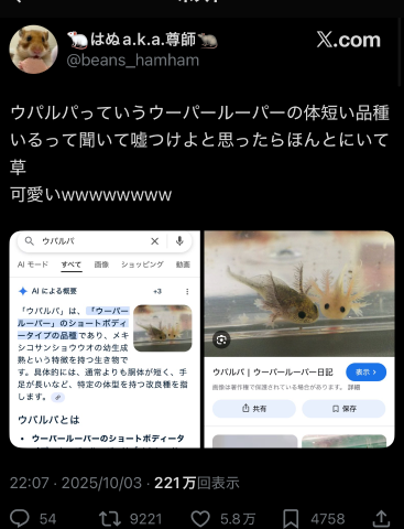 ミニウーパールーパーを、ウパルパって名付けたのちょっと笑える笑