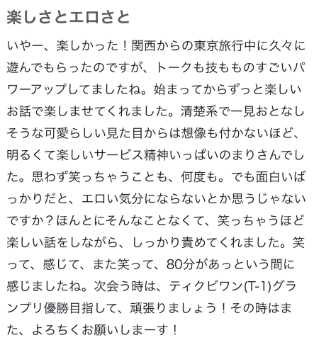 まりちゃんから見ても魅力的な女の子がたくさんいる中で、まりちゃんを選んでくれたからには心も体もまるっと楽しませられたらいいな〜なんて思いながら毎日いじいじさわさわお喋りしてるんだけど、それをサービス精神いっぱい!って褒めてくれるなんてうれしすぎる( ; _ ; )♡
