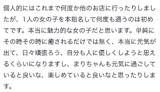 このお店でもそうだし、他のお店もそうだけど、本当に色んな魅力を持つ女の子がたくさんいる中で、まりちゃんを見つけてくれたり気になってくれるだけでも嬉しいのに、会いに来てくれたんだから絶対楽しい気持ちで帰ってもらうぞ〜‼️って思ってるから⬆️のように言っていただけるのうれしすぎる(T_T)