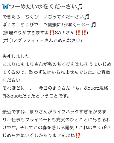 普段のまりちゃんの日記を読んでくれているおにいさんたちならなんとなく、SA!!!くんの口コミパッと見ただけでまりちゃん節が効きまくってるの気付いてくれそうWWW 一瞬、まりちゃんがこの口コミ書きましたっけ❓とか思ったけどそんなわけ無かった‼️ゴーストライター認定します(いいえ、全ての日記はまりちゃんが書き上げています☝️)それだけいつも日記を読み込んでくれているというわけだね♪愛だ😻てかやばい、SA!!!くん、次会った時ぜったいアゲハ蝶歌ってね😻