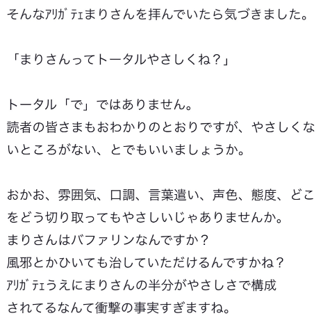 え〜⁉️ほんとに😆WWW やさしいって褒めてもらえること、ありがたいことに多いけど自分だとよく分からない😆やさしいのかな❓あ、ちくびに対してはいつもやさしく、しかし時々激しく☝️は意識してますよ!(またちくびの話⁉️)でも、まりさんのことをやさしいって言ってくれて色んなところをいい所!って褒めてくれるおにいさんたちみんなの方がやさしいよ♪お兄さんたちが優しいからまりちゃんも優しくなれちゃうのかも😻あと、ちくびが好きな人なんてみんなかわいいから甘やかしたい可愛がりたい♪の気持ち強いから優しく居られてるのかも( ˆОˆ ) 風邪に効くかはわからないけど、おにいさんの全部をまるっとかわいがりたい♪おにいさんたちの日々の疲れにも効いてたらいいんだけど😾