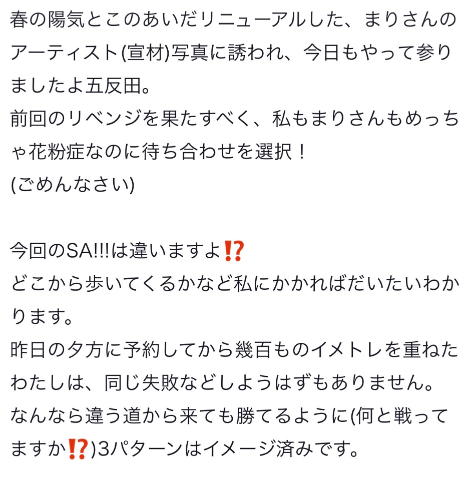 花粉症じゃないお兄さんはそのまま花粉症にならない事を願いつつ、もう既に花粉症に苦しめられているお兄さんとは同じ気持ちを共有できるなとおもって、これは逆にえっちなのかも!と思いました‼️ですから苦しみながら待ち合わせしたの、たのしかった♪それに、たぶんこの前まりちゃんが待ち合わせ楽しい!って日記上げたから今回も待ち合わせしてくれたのかなって思ったんだけど、どう😝?ありがとね♪