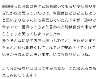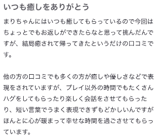 改めて、いつもとっても楽しい時間を一緒に過ごしてくれて、おうちに帰ったあとも思い出して口コミ書いてくれてほんとうにありがとう🌟お兄さんたちが口コミに残してくれる嬉しい言葉がまりちゃんの日々のおまもりになっている!お兄さんたちにとってもまりちゃんと過ごす時間がおまもりみたいに、ふとした時に少しでもたのしい気持ちになれる思い出になったらいいな❗️