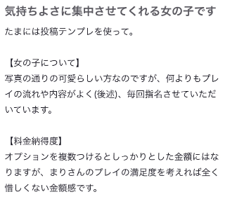 料金納得度もまりさんのプレイの満足度を考えれば全く惜しくない金額だと書いて貰えててこれまたうれしすぎる🥲 オナクラだと考えたら決して安くは無いお金を頂いているというのもあって、どうやったらお兄さんたちにとって満足度の高い時間だったと感じてもらえるかな❓って、ちくびいじりさせてもらえる度に考えてたところなので、まりちゃんのちくびいじりに対してなら惜しくない❗️と思ってもらえるのは毎日の研究が少しでも役に立ったかな?と思えて嬉しい〜‼️😽