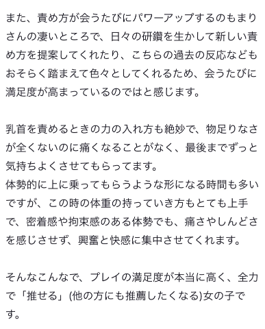わあ〜(;-; )時間いっぱいまで退屈さを感じることがないっていってもらえるのうれしすぎる(;-; )ついついちくびを前にすると集中してしまって自分が得意な攻め方をしちゃったりするんだけど、それだとバリエーションが無いじゃないか‼️と思って特に最近いろんな体勢考えてて、思いついたら実践‼️という感じでお兄さんを巻き込んでるんだけど、最初から最後まできもちいいって言ってくれて嬉しい🎶 それに、体勢やまりちゃんがいる位置でもお兄さんの気持ちや感じ方が変わるんじゃないかな❓と思ってるから、お兄さんたちのいろんな表情を引き出せるのが最近の楽しみの1つ😝