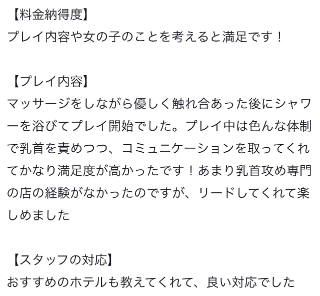 良い雰囲気でプレイを進めてくれてリラックスできました❗️と言ってもらえてうれしい😝やっぱり緊張もすると思うんだけど、できるだけリラックスした状態でちくびと気持ちいいに集中できるのが一番気持ちいいと思うんだ❗️これからもお兄さん達が心地いいちくびいじりを体験できるような雰囲気作りをがんばっちゃお🥳褒めてくれるとさらに頑張れちゃうな🥳