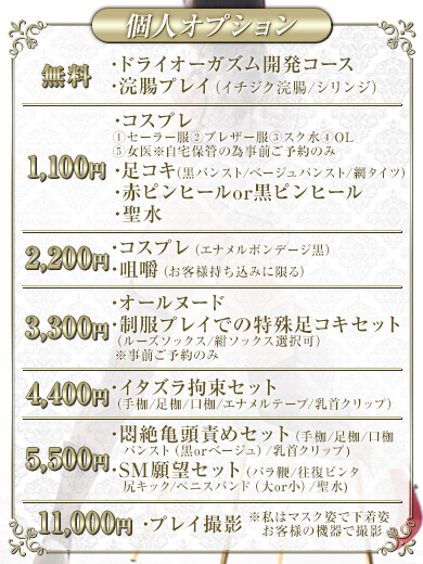 ・SM願望セット(バラ鞭、往復ビンタ、尻キック、ペニスバンド(大or小)、聖水)※事前ご予約のみ